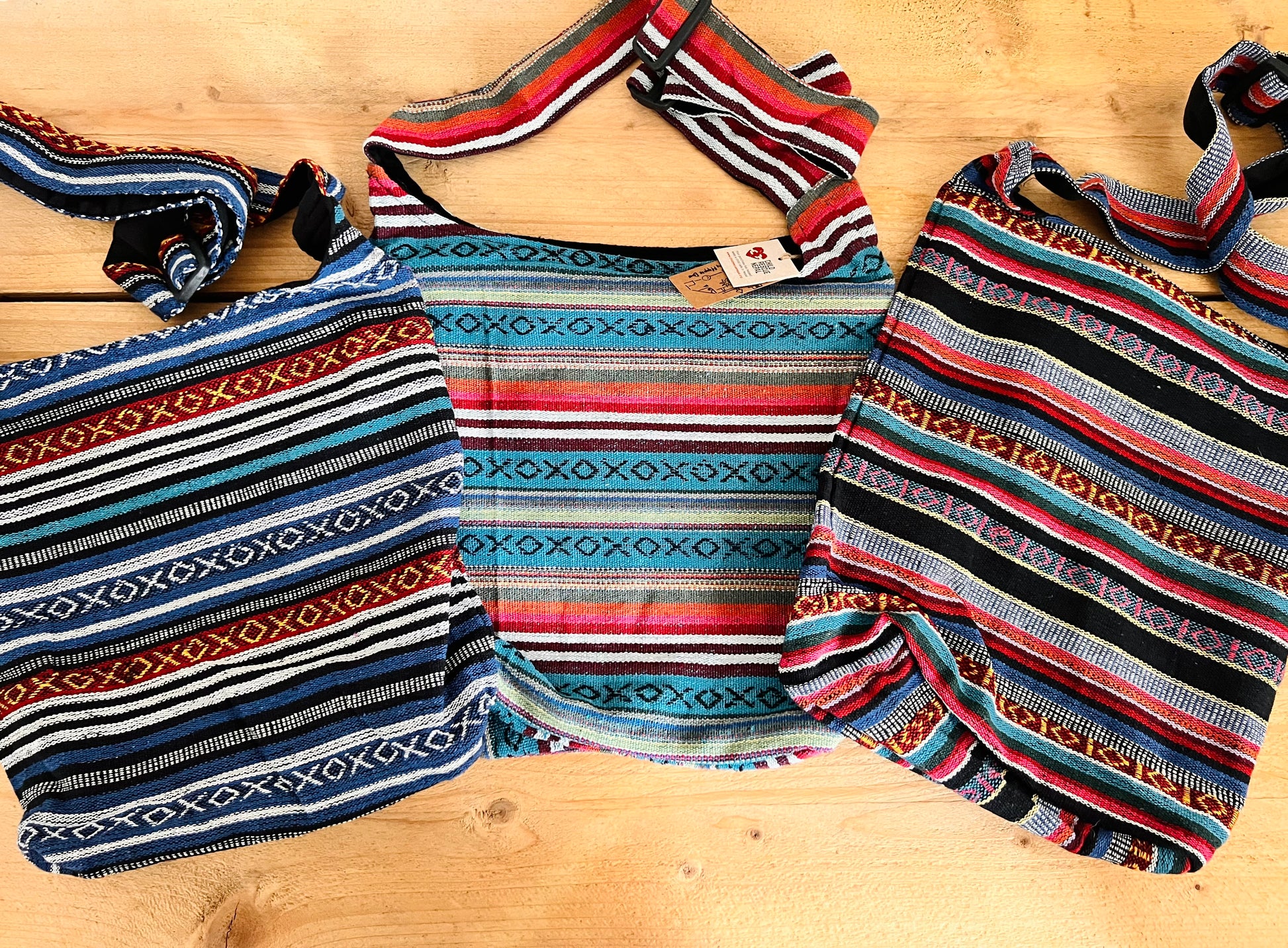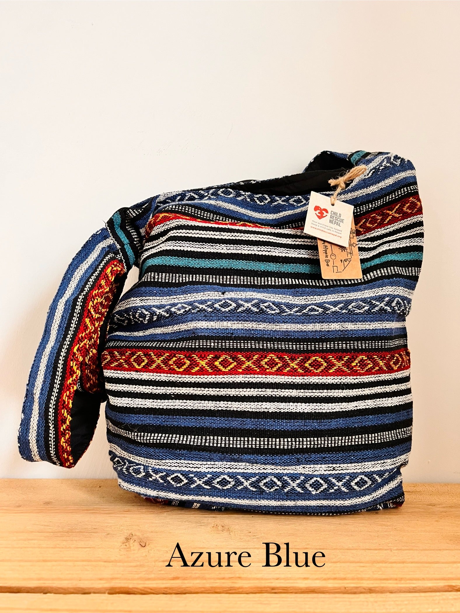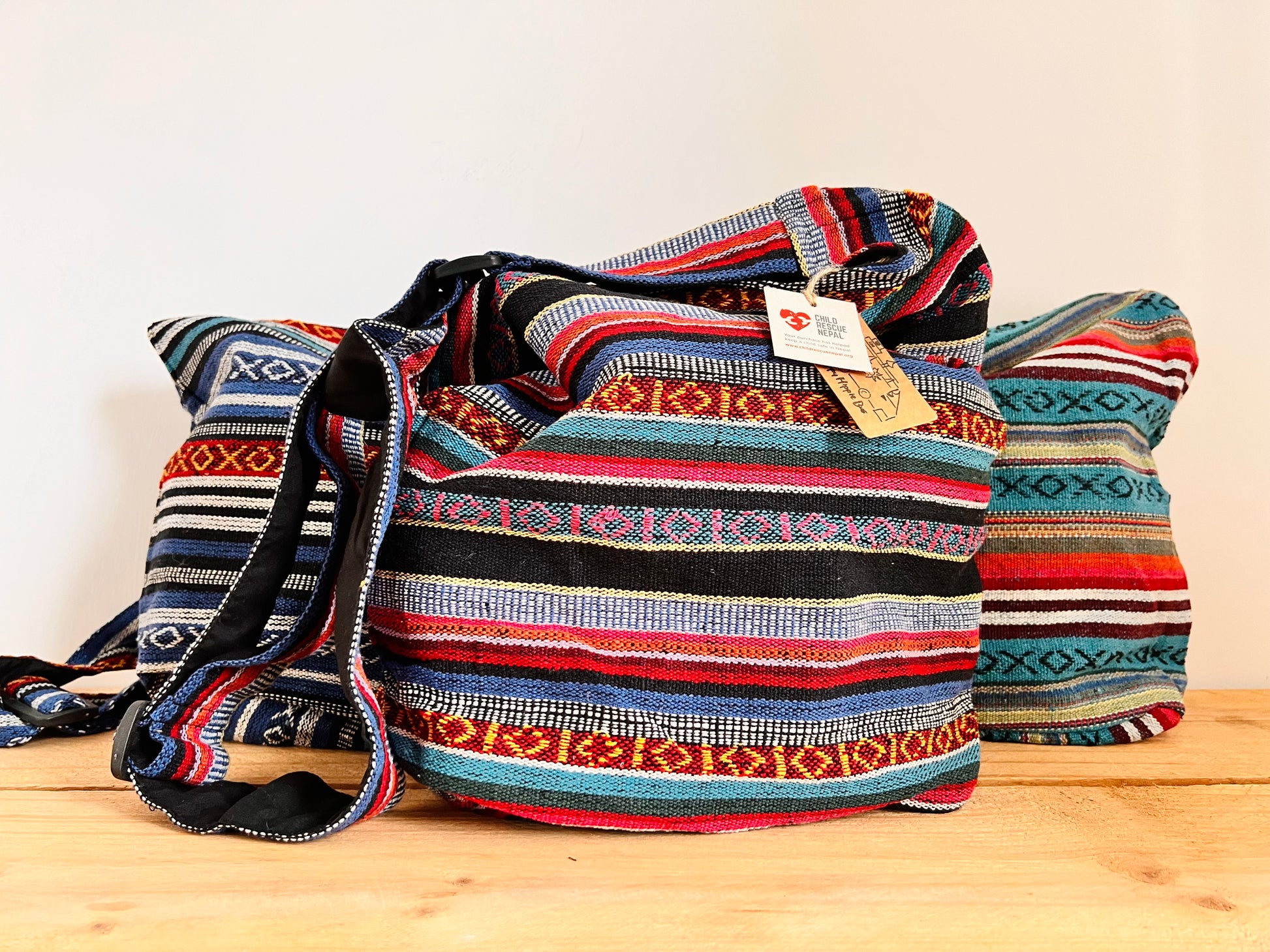 Made from a sturdy woven fabric called Gheri, this jogi bag with strap has been produced using an age old weaving technique on backstrap looms. Each piece is hand woven colours of the fabric may slightly vary, giving you a truly unique item.