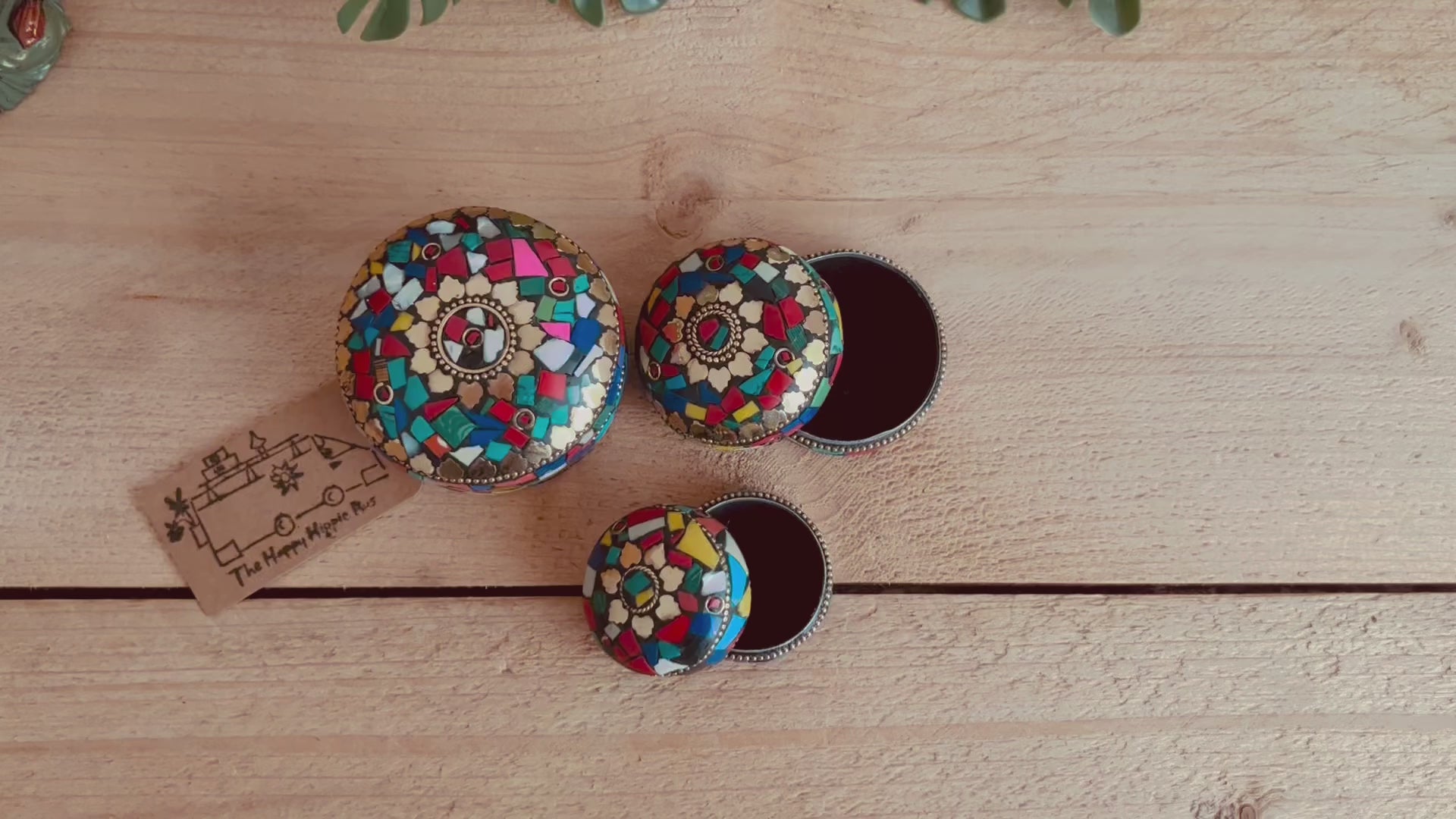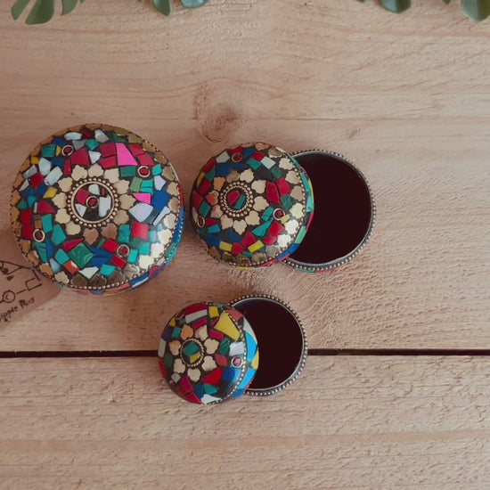 A beautifully handcrafted set of three multicolour mini mosaic trinket boxes with gold embellishments, made from metal using traditional fair trade techniques.