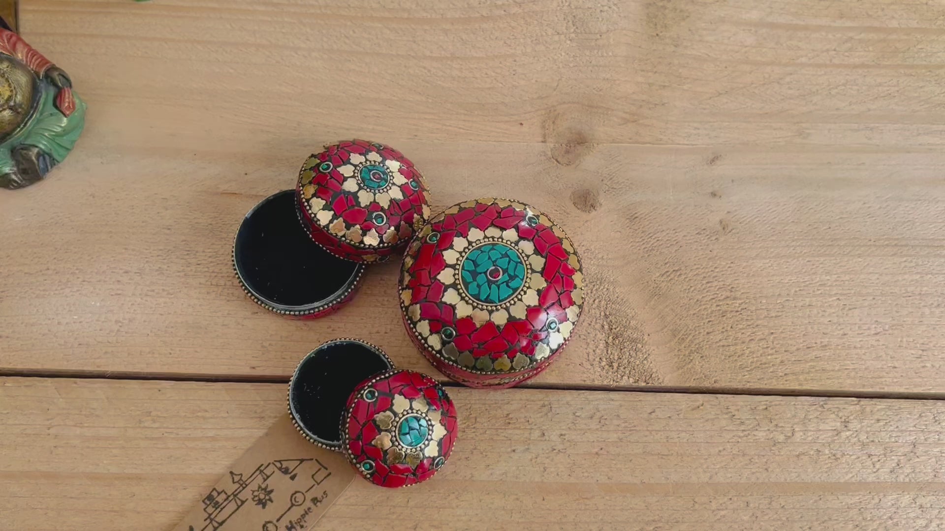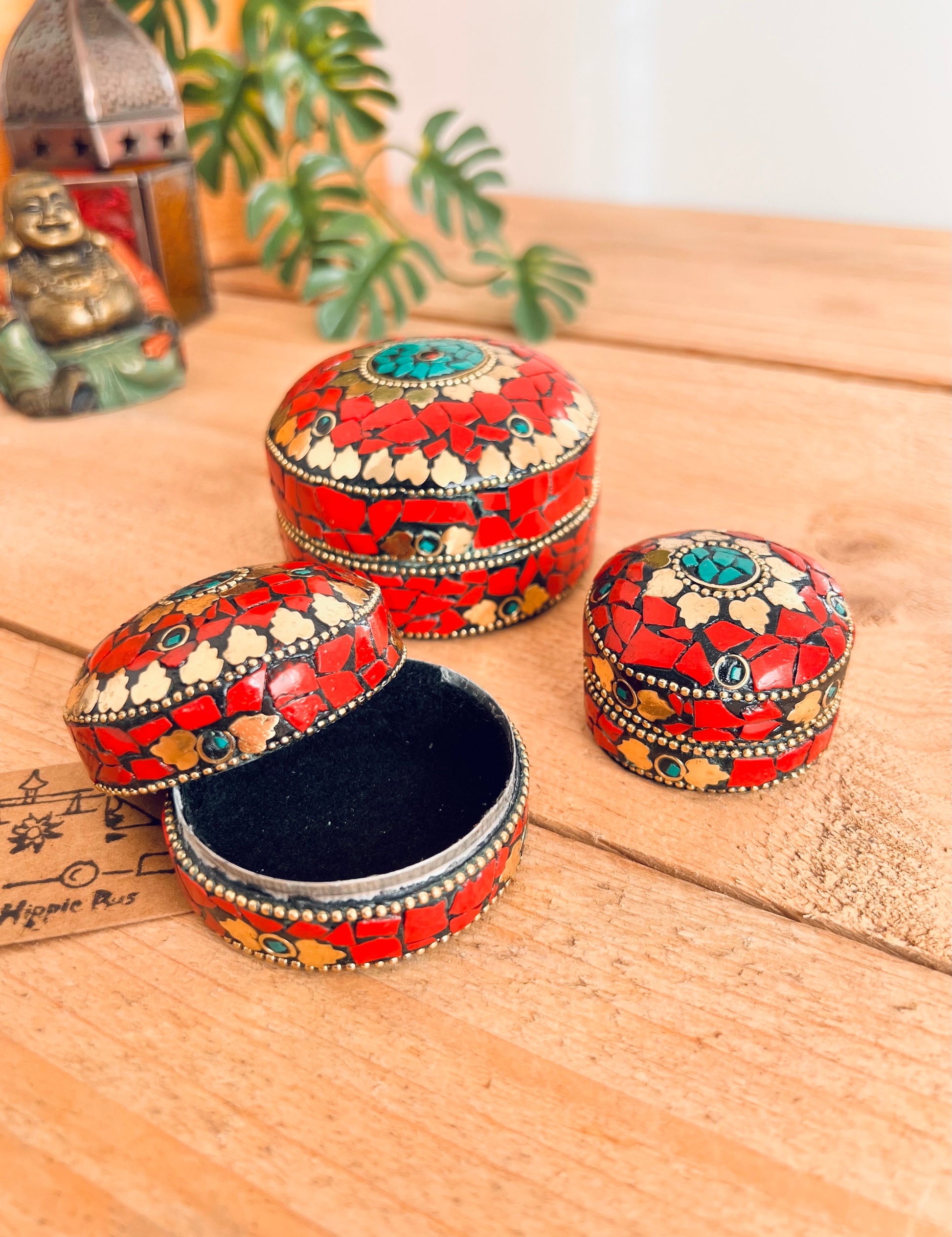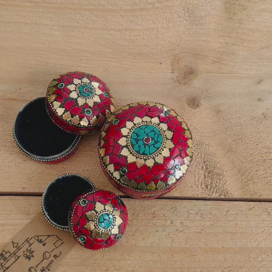A beautifully handcrafted set of three mini red and gold mosaic trinket boxes, made from metal using traditional fair trade techniques.